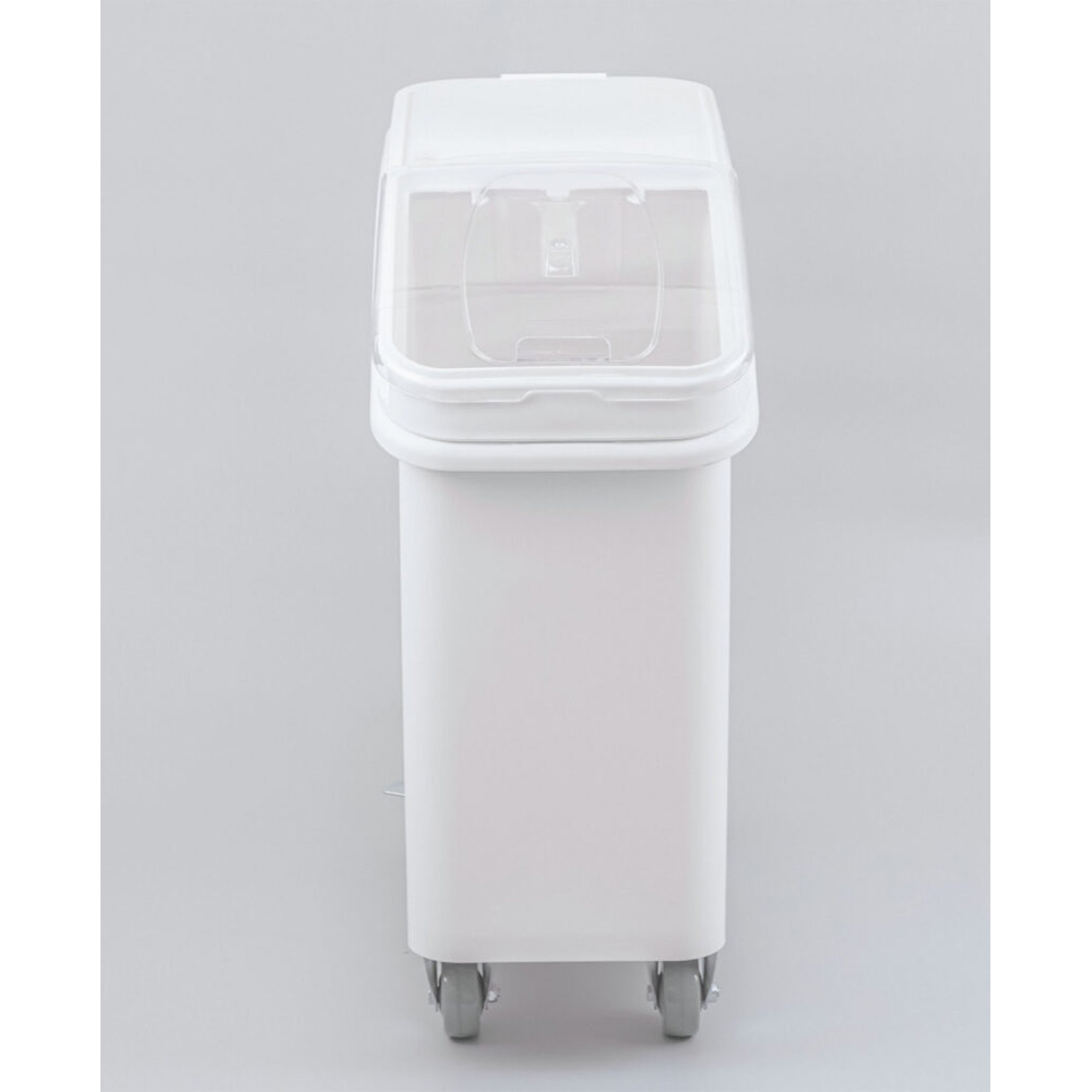 Виготовлений з поліпропілену (прозора кришка з полікарбонату) на колесах і призначений для зберігання та розтарювання різних сипких продуктів.