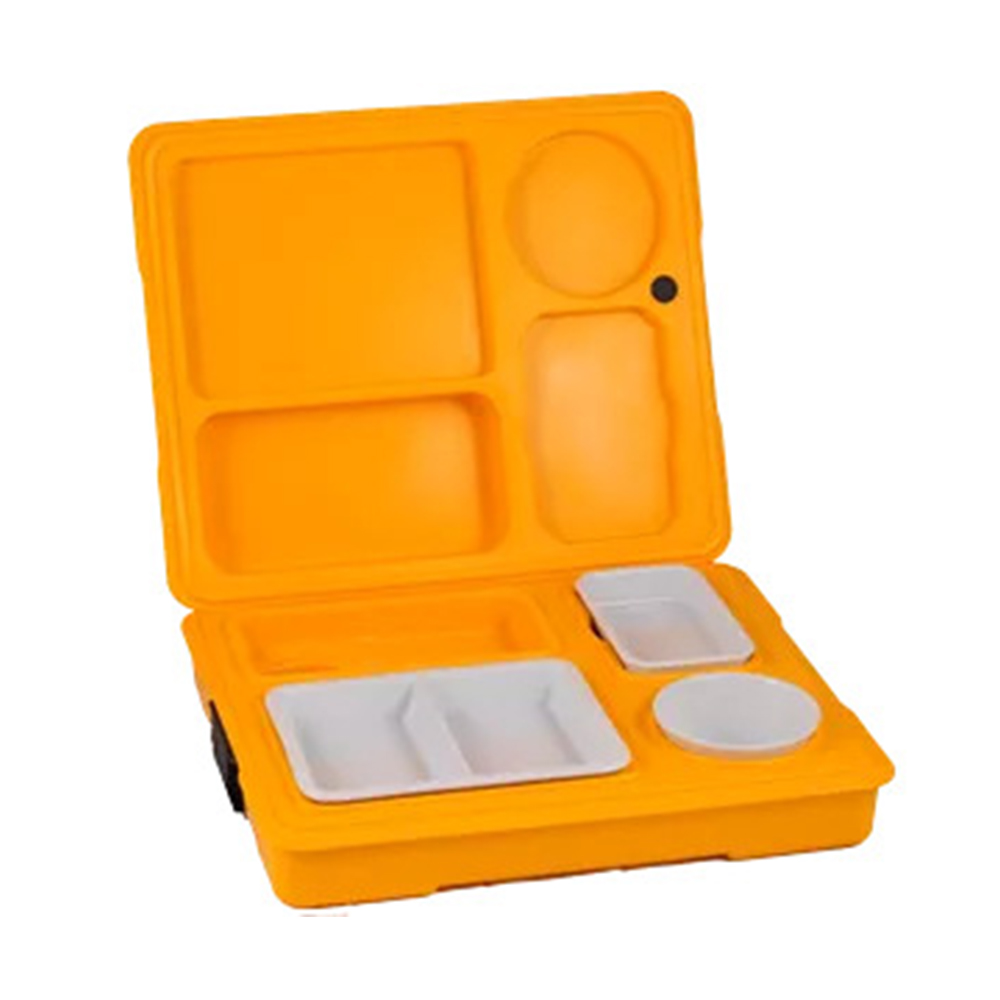 Усередині піднос розділений на секції для страв та виїмка для приладів, такий поділ дає можливість ставити поруч гарячі та холодні страви, зберігаючи їх температуру.